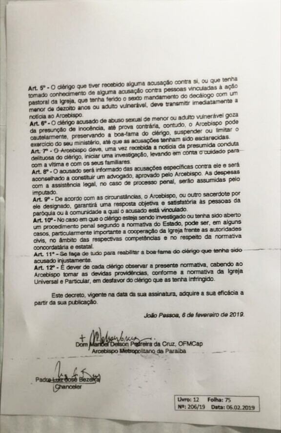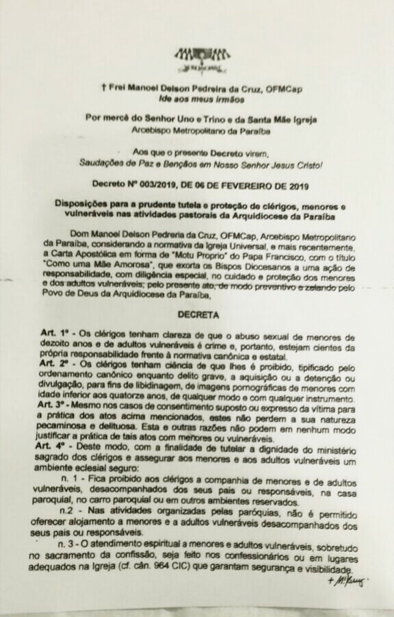 A partir de agora, os padres de todas as igrejas da Arquidiocese da Paraíba estão proibidos de estar na companhia de crianças, adolescentes e adultos vulneráveis em locais reservados. A medida está entre a série de recomendações de um decreto, assinado pelo arcebispo metropolitano, Dom Manoel Delson, e apresentado aos sacerdotes que atuam na Arquidiocese do Estado.
