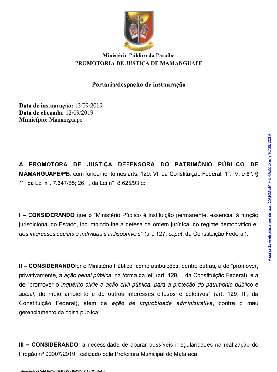 A portaria que instaura a investigação está assinada pela promotora de Justiça de Mamanguape, Carmem Perazzo.