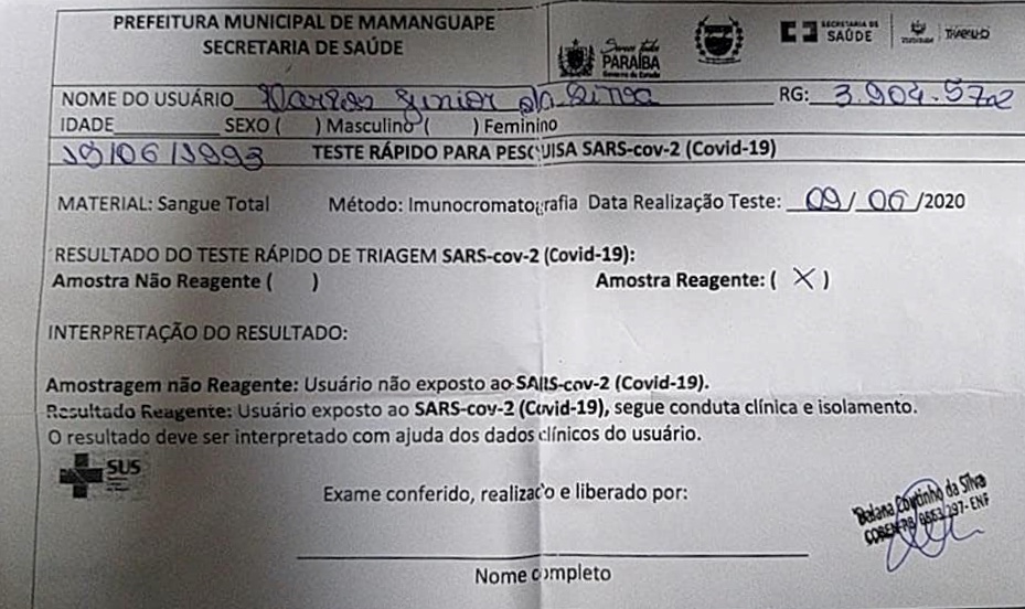 A confiabilidade dos exames para detectar o novo coronavírus é colocada em cheque na cidade de Mamanguape, no litoral norte do estado. De acordo com relatos de um paciente que realizou a procedência para identificar se estaria com a Covid-19, na rede pública de saúde municipal e em uma clínica privada, veio a surpresa, ambos exames testarem diferente os resultados, na mesma data: 09/06/2020, Intrigando a população após vim a público.