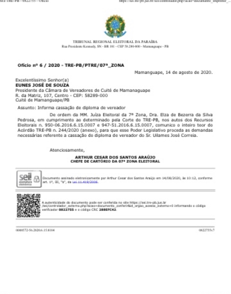 O Tribunal Regional Eleitoral da Paraíba (TRE-PB) manteve, em decisão datada no dia 3 de agosto, a sentença do juízo da 7ª Zona Eleitoral de Mamanguape, que cassou o diploma do vereador de Cuité de Mamanguape, Uilames José Correia (PSD). O parlamentar foi alvo de uma Ação de Investigação Judicial Eleitoral (Aije) nas eleições de 2016.