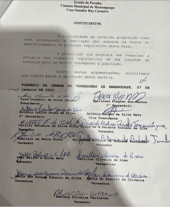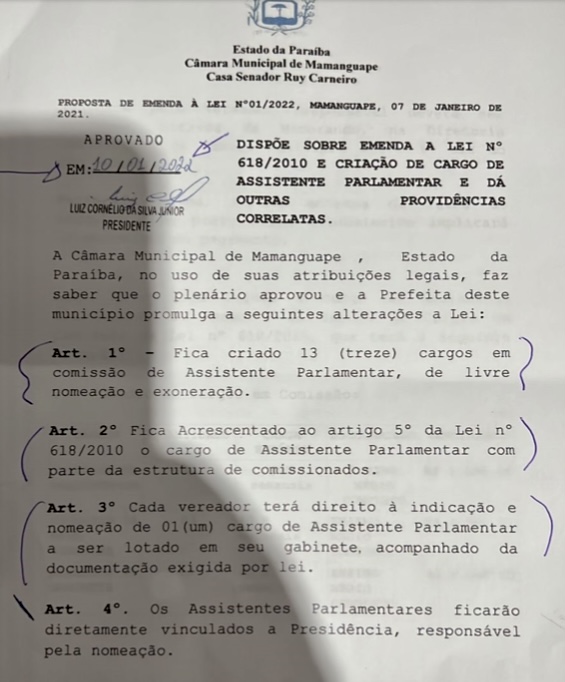O site teve acesso a uma cópia do referido Projeto de Lei (Veja a cópia abaixo) e pelo texto que foi aprovado e assinado pelo presidente Luiz Cornélio da Silva Júnior, o Júnior da Padaria, esses novos assessores trabalharão 40h semanais, porém, fontes ouvidas pela nossa redação afirmam que a Câmara de Mamanguape só funciona pela com expediente pela manhã, o que na prática não teria nem como essa carga horária ser atingida. A mesma fonte acredita que pode está havendo uma manobra para beneficiar os parlamentares, sendo preciso do olhar atento do Ministério Público e Tribunal de Contas.