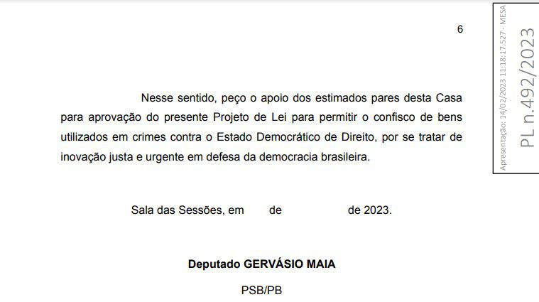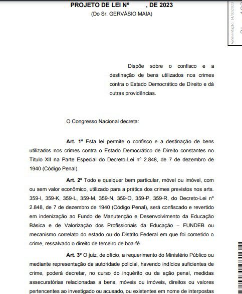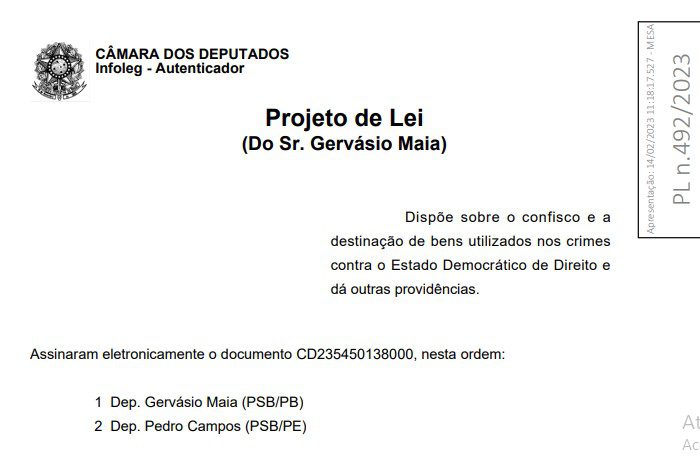 O deputado federal Gervásio Maia (PSB), apresentou o Projeto de Lei de número 492/2023, que dispõe sobre o confisco e a destinação de bens utilizados nos crimes contra o Estado democrático de Direito e dá outras providências.