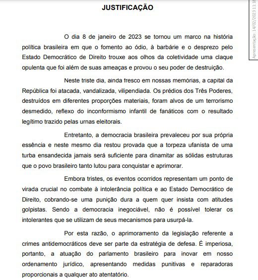 A proposta é baseada após os atos do dia 8 de janeiro de 2023.