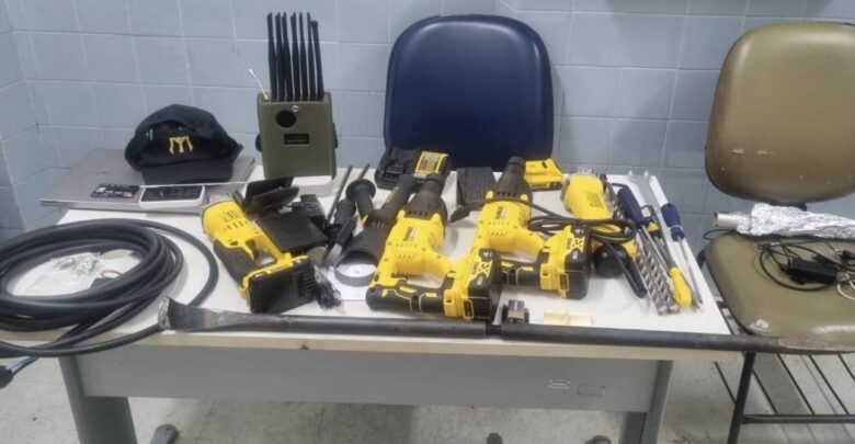 De acordo com informações da PM, os suspeitos estavam em um carro com equipamentos como pé de cabra, broca, chave de fenda e um jammer – aparelho usado para bloquear sinais de celular, wi-fi, GPS e outros meios de comunicação. O material foi apreendido durante a abordagem.