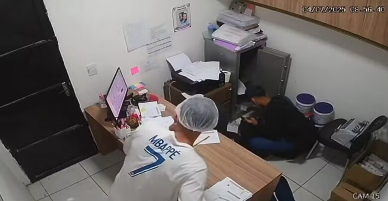 O circuito de segurança do supermercado mostra um suspeito armado entrando no escritório do estabelecimento com uma funcionária. Ela abre o cofre e deita no chão, e o suspeito coloca o dinheiro dentro de um saco preto.