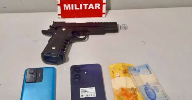 A prisão aconteceu após a guarnição ser acionada para averiguar um assalto a um comércio local. Com base nas informações repassadas por testemunhas, os policiais iniciaram buscas e conseguiram localizar os suspeitos. Eles estavam com um simulacro de arma de fogo e parte dos objetos roubados.