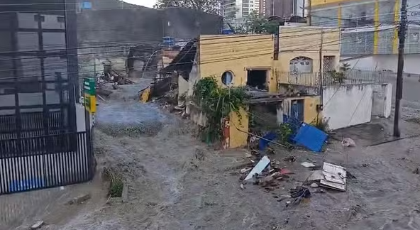 Ruas ficaram alagadas e carros foram arrastados, três casas desabaram, uma idosa acamada de 62 anos morreu e outras duas pessoas ficaram feridas.