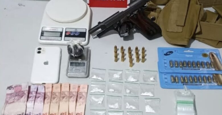 Durante a abordagem e diligência no local, foram apreendidos uma pistola calibre .765, munições, dinheiro fracionado, balanças de precisão, carregador de pistola, porções de substâncias semelhantes à cocaína e à maconha, além de material usado para embalar entorpecentes.