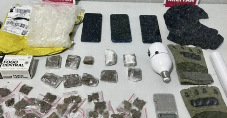 Na varredura, os policiais encontraram 43 porções e 10 tabletes de substância semelhante à maconha, balança de precisão, balaclava, luvas táticas, pinos plásticos para armazenamento de entorpecentes, documentos e celulares.